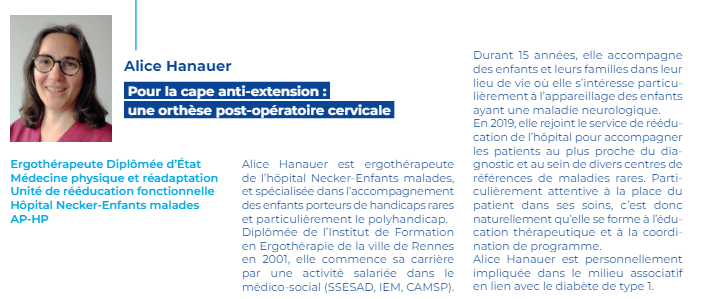 - trophée du Soignant innovant : Alice Hanauer, hôpital Necker-Enfants malades AP-HP pour sa cape anti-extension, une orthèse post-opératoire cervicale ;