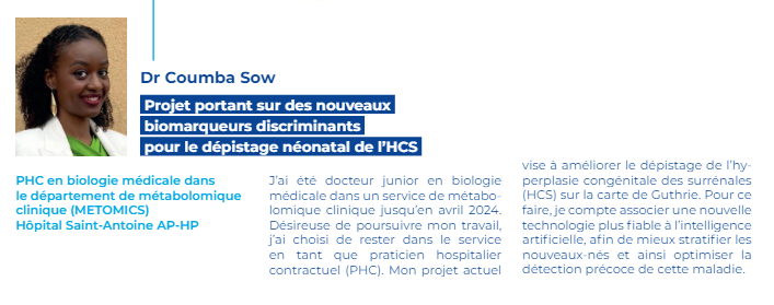 - trophée de l'Interne innovant : Dr Coumba Sow, hôpital Saint-Antoine AP-HP, pour son projet portant sur des nouveaux biomarqueurs discriminants pour le dépistage néonatal de l'HCS ;