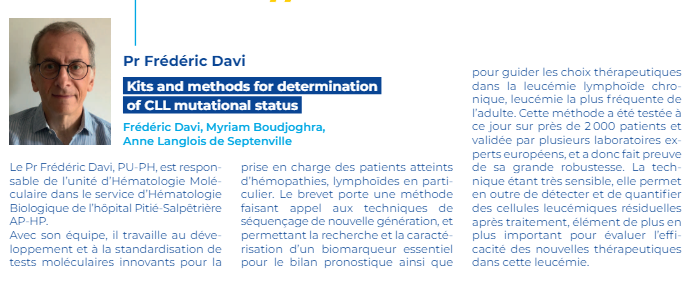 trophée du Brevet prometteur : le Pr Frédéric Davi, hôpital Pitié-Salpêtrière AP-HP pour sa méthode détermination du statut mutationnel des gènes des chaînes lourdes des immunoglobines dans la leucémie lymphoïde chronique.