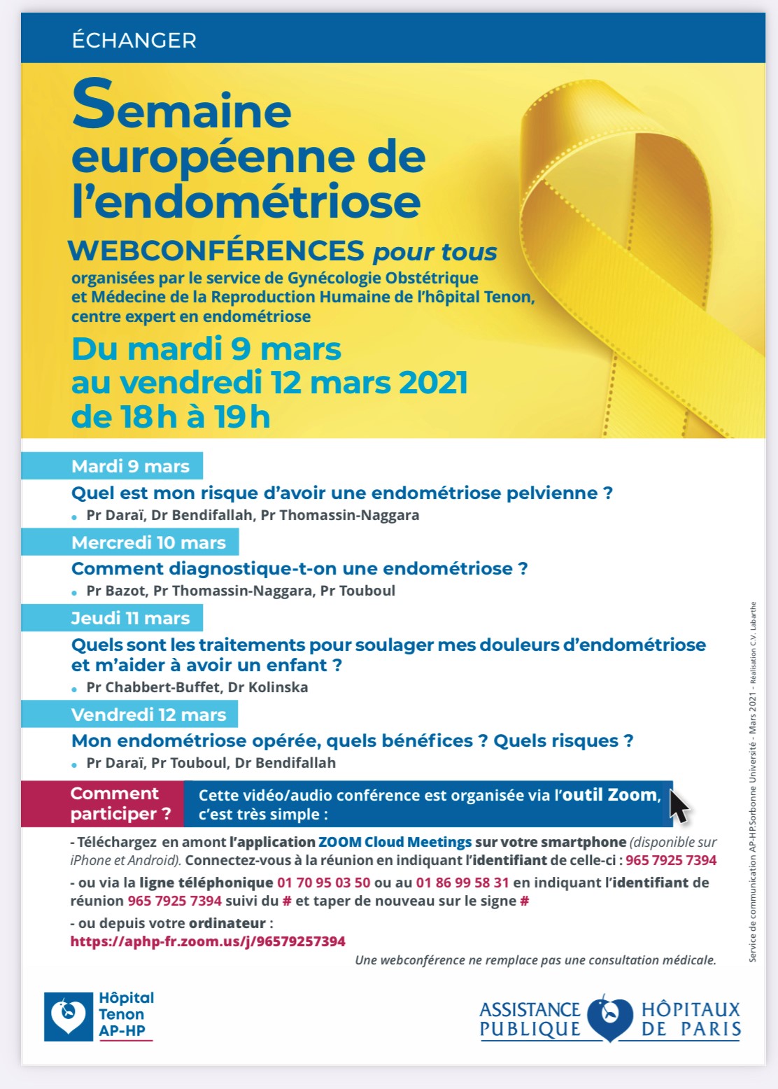 Dans le cadre de la semaine européenne de l'endométriose, le service de gynécologie obstétrique et médecine de la reproduction humaine de l'hôpital Tenon AP-HP, centre expert en endométriose, organise des webconférences pour tous, du mardi 9 mars au vendredi 12 mars 2021 de 18h à 19h, toutes les informations nécessaires ci-dessous :