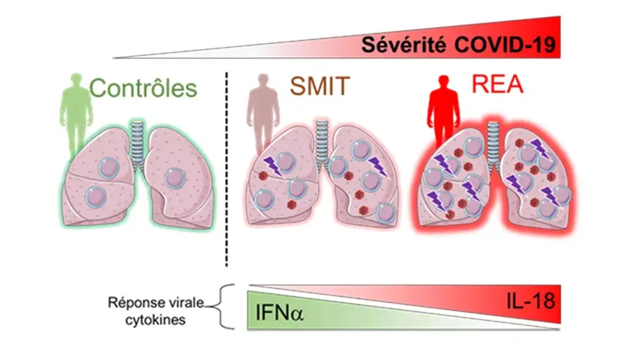 Les auteurs de cette publication ont montré que dans le sang des « patients COVID-19 », plus la maladie est sévère, plus il y a de monocytes inflammatoires. Les monocytes des patients hospitalisés en maladies infectieuses produisent plus d’IFNα, une cytokine réduisant la charge virale, alors que ceux des patients en réanimation produisent plus d’IL-15 et d’IL-18, des cytokines qui favorisent la réaction inflammatoire incontrôlée et l’activation des cellules MAIT.