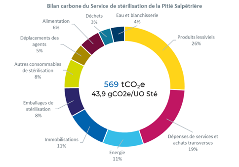 Les principaux postes d’émissions sont les produits lessiviels (26%) suivis par les dépenses d’énergie (11%), la production des laveurs et autoclaves (immobilisations ; 11%) et les emballages de stérilisation (8%). Autre post significatif (19%), les services et achats transverses (19%) regroupent différentes natures d’impacts, dont notamment les services liés à l’intérim, à la maintenance des équipements et les consommables de bureautique.
