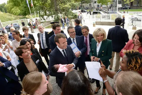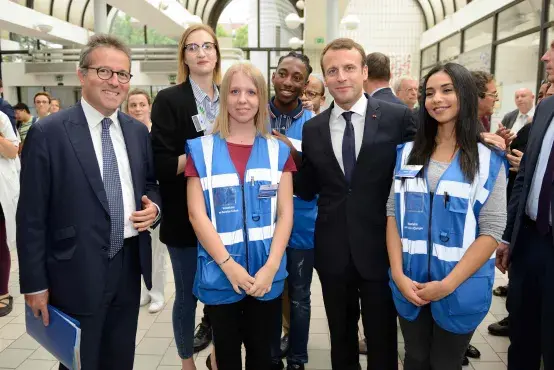 Il était accompagné de la ministre des solidarités et de la santé, Agnès Buzyn, du secrétaire d'Etat au numérique et élu député du 19ème arrondissement de Paris, Mounir Mahjoubi. Brigitte Macron, son épouse était également présente lors de ce déplacement.