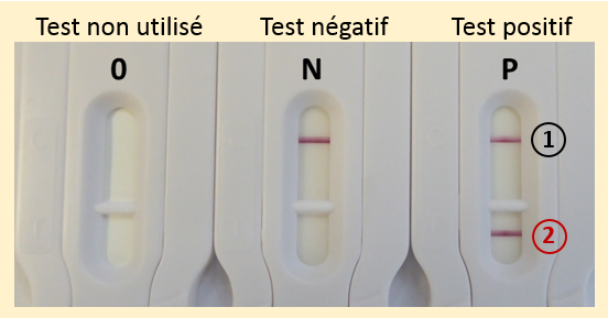 Aperçu des tests-bandelettes développés contre la résistance aux β-lactamines commercialisés en août 2017 par NG Biotech, 1 : lignes contrôles ; 2 : ligne test