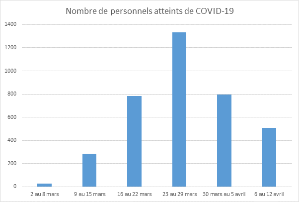Selon les données des équipes opérationnelles d’hygiène et des services de santé au travail des hôpitaux de l’AP-HP, au 12 avril 2020 ce sont 3 800 professionnels qui ont été ou sont atteints de COVID-19.