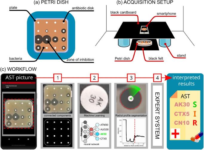 Etapes d’analyse d'un antibiogramme (ou e-plaque AST) avec l'application (article : AI-based mobile application to fight antibiotic resistance).