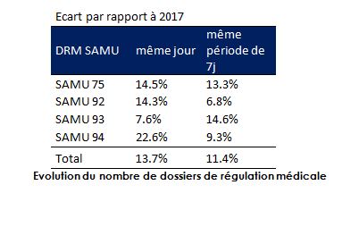 - Le nombre de dossiers de régulation médicale des 4 Samu de l’AP-HP (75, 92, 93 et 94) a légèrement augmenté au cours des derniers jours. Il est supérieur de 11% par rapport à la même période de l’an dernier.