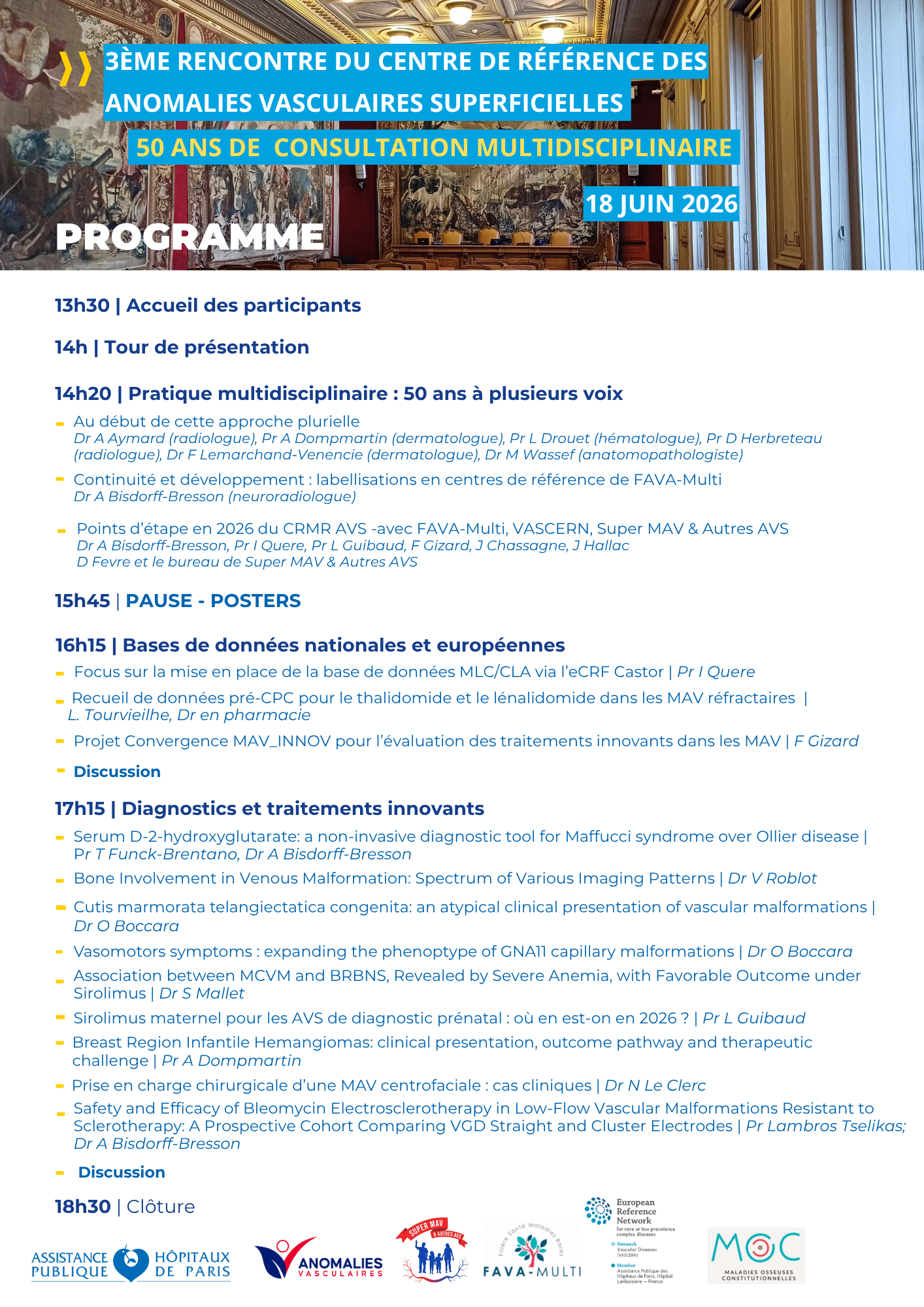 Le centre célèbrera et relatera les 50 ans de consultation multidisciplinaire des angiomes à l'hôpital Lariboisière. Un point sera fait sur les actions et projets du centre de référence AVS et de son réseau, avec présentations et temps de concertation ouverte.