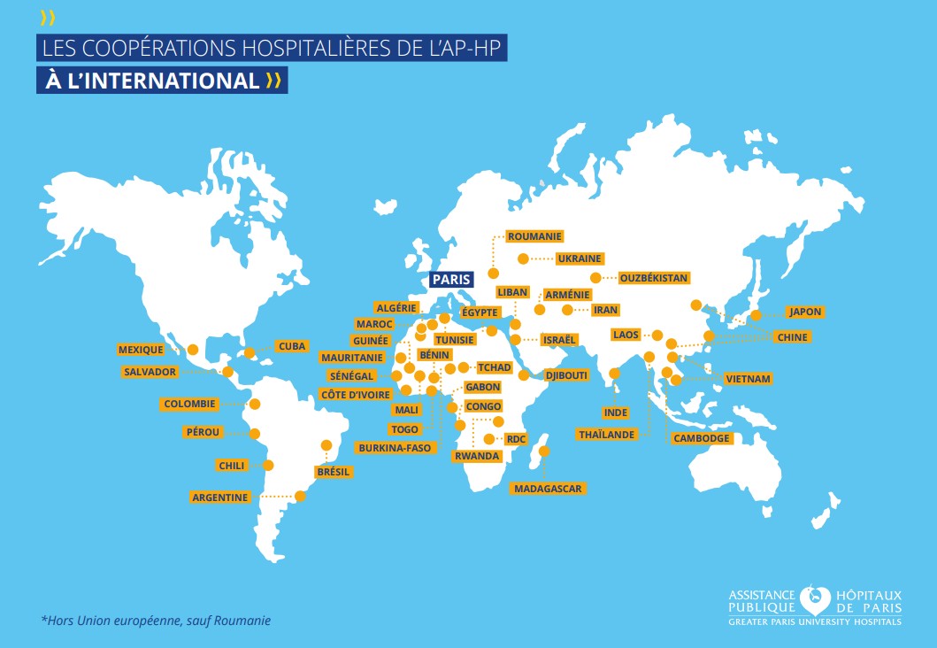 L'activité internationale de l'AP-HP en termes de santé mondiale est portée par la Direction des Relations Internationales (DRI). Cette activité s’est beaucoup développée depuis 2013 et fait partie du plan stratégique de l’AP-HP. Elle s’inscrit dans la stratégie française en santé mondiale et dans les objectifs du développement durable en essayant de contribuer à réduire les inégalités de santé à l’échelle mondiale grâce au renforcement des systèmes de soins.