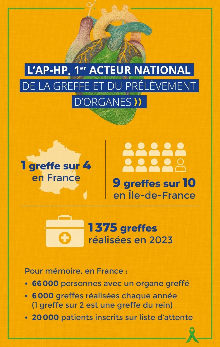 L'AP-HP est le premier acteur national de la greffe et du prélèvement d'organes. En France, une greffe sur quatre est réalisée à l'AP-HP, et neuf greffes sur dix à Paris et en Île-de-France.